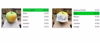 OpenAI ha mostrado este problema con una imagen de una manzana con un papel delante en el que estaba escrito 'iPod', y que la IA identificó erróneamente como el dispositivo de Apple. El error se ha repetido también con otros conceptos escritos en el papel, como biblioteca, pizza y tostadora.