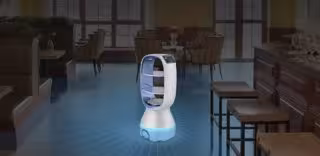 Peanut, desarrollado por la empresa Kenon, avisa de su llegada a medida que avanza por los pasillos, para que las personas abran la puerta y salgan lo justo para recoge las bandejas que transporta.