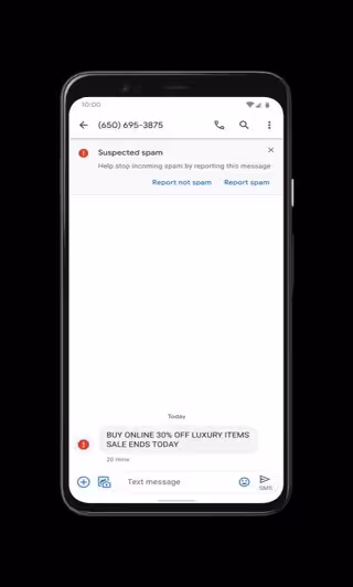 Otra de las actualizaciones es la detección de spam en los SMS en tiempo real. Esta función advierte al usuario de la sospecha de spam y sitios webs inseguros que ha detectado. Google, además, ha pedido la colaboración de sus usuarios para que confirmen si se trata de una amenaza o no para así poder mejorar la función.
