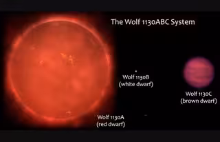 En el sistema estelar Wolf 1130ABC, ubicado a 54 años luz del Sol en la constelación del Cisne, la enana marrón Wolf 1130C describe una órbita amplia alrededor de un sistema estelar doble compacto, compuesto por una estrella roja fría (Wolf 1130A) y una enana blanca masiva (Wolf 1130B).