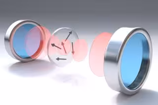 El módem cuántico de Garching: el disco de cristal con los bits cuánticos de átomos de erbio (flechas) está en el medio, la luz infrarroja reflejada hacia adelante y hacia atrás está indicada por los discos rojos. - CHRISTOPH HOHMANN (MCQST)