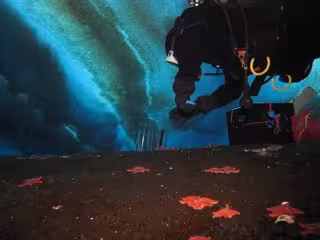 Una alfombra microbiana expansiva, de unos 70 metros de largo por un metro de ancho, se formó en el fondo del mar a unos 10 metros debajo de la superficie del océano congelado. Estas alfombras, que son producidas por bacterias que existen en una relación simbiótica con los consumidores de metano, son una indicación reveladora de la presencia de una filtración, dijo Thurber.