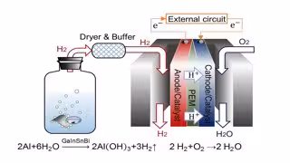 Cuando la aleación se encuentra con una placa de aluminio sumergida en agua, se produce hidrógeno. Este hidrógeno está conectado a una pila de combustible de membrana de intercambio de protones, un tipo de batería donde la energía química se convierte en energía eléctrica.