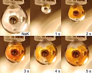 Sin embargo, se sabe que la química entre los metales alcalinos y el agua es explosiva. El sodio u otros metales alcalinos comienzan a arder inmediatamente en el agua. Pero el equipo encontró una manera de mantener esta química violenta bajo control: no arrojaron un trozo de metal alcalino al agua, sino que lo hicieron al revés: pusieron un poquito de agua en una gota de metal alcalino, un aleación de sodio-potasio (Na-K), que es líquida a temperatura ambiente.