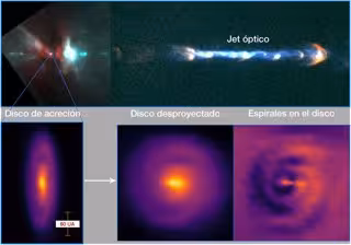 Una parte del flujo que atraviesa el disco para dirigirse a la estrella en formación se desvía y forma estos espectaculares chorros. En observaciones realizadas anteriormente a una resolución de 120 UA (unidades astronómicas), se detectó el disco de acreción orbitando alrededor de la protoestrella en un radio de 160 UA.