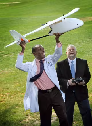 "Un avión no tripulado podría recorrer 100 kilómetros en 40 minutos --dice Amukele--. Son menos costosos que las motos y no están sujetos a retenciones de tráfico, y la tecnología ya existe para el avión no tripulado para ser programado para llevar a unas coordenadas marcadas por GPS como una paloma mensajera".
