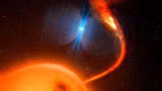 El sistema estelar, conocido como J0240, es solo el segundo de su tipo registrado. Se identificó en 2020 como una variable cataclísmica inusual: un sistema binario que consta de una estrella enana blanca y una estrella roja donante de masa. Normalmente, la estrella enana blanca compacta recoge el gas donado y crece en masa. En J0240, sin embargo, la enana blanca magnética de rápido giro rechaza el gas del donante y lo impulsa fuera del sistema binario.