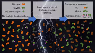 Las moléculas de nitrógeno, oxígeno y vapor de agua se rompen por los rayos y las descargas eléctricas más débiles asociadas, generando los gases reactivos NO, O3, HO2 y el limpiador de la atmósfera, OH. - Jena Jenkins