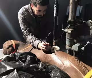 El paleontólogo Tom Cullen cortando el hueso del muslo del T.Rex para aprender cómo creció - DAVID EVANS