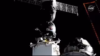 Skvortsov voló la nave espacial, retrocediendo a unos 124 pies (38 metros) de la estación espacial antes de completar una maniobra de desplazamiento para llevarlos al módulo Poisk para el atraque manual.