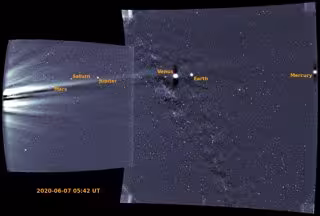 El generador de imágenes estaba haciendo precisamente eso en junio pasado, en el enfoque más cercano (o perihelio) de su órbita, cuando su campo de visión se alejó del borde del Sol y se dirigió a los planetas más allá. Es una perspectiva interesante: Mercurio, el planeta más interno, parece estar más lejos del Sol. La imagen, publicada ahora, también incluye los seis planetas visibles a simple vista.