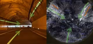 (I)Un túnel curvo, con líneas formadas por las luces del túnel y los marcadores de carril de la carretera, forma una geometría similar al modelo propuesto de la región del abanico y espolón polar norte. (D) El cielo como sería en ondas radiopolarizadas. - DOMINION RADIO ASTROPHYSICAL OBSERVATORY