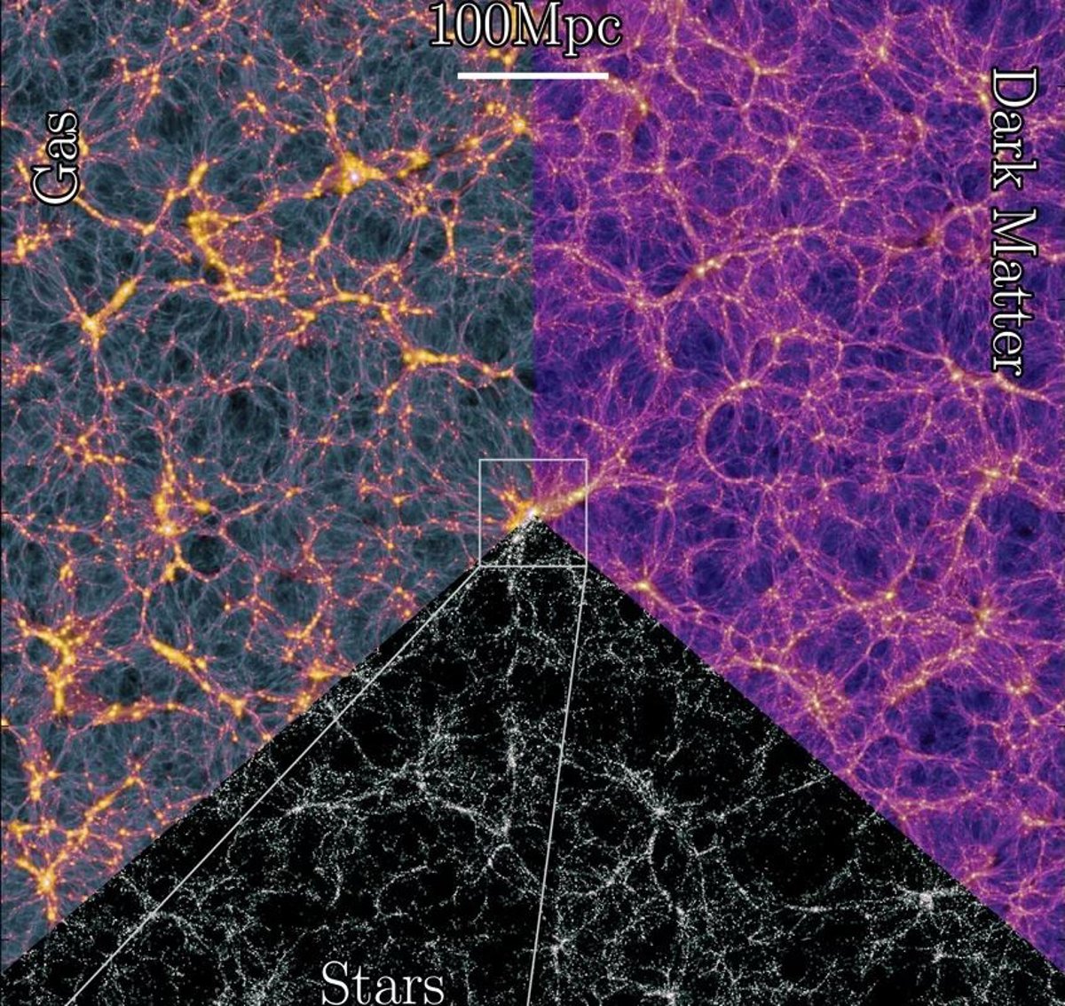 Además, utilizaron el código hidrodinámico de malla móvil AREPO para seguir los procesos de formación de galaxias directamente en volúmenes aún tan grandes que pueden considerarse representativos del universo en su conjunto. La comparación de los dos tipos de simulaciones permite una evaluación precisa del impacto de los procesos bariónicos relacionados con explosiones de supernovas y agujeros negros supermasivos en la distribución total de la materia.