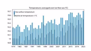 Temperaturas (C) medias en mares libres de hielo para el mes de mayo en el periodo de 1979 a 2023. Las barras azul claro indican la temperatura de la superficie del mar y las barras azul oscuro muestran la temperatura del aire marino con un desplazamie