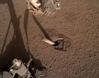 Habiendo determinado que el brazo robótico del módulo de aterrizaje no sujetaba el taladro en su lugar, retrajeron el brazo y tomaron nuevas imágenes para ver cómo ha cambiado el agujero que se formó alrededor del taladro.
