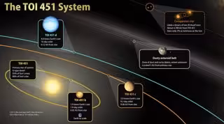 Esta ilustración esboza las características principales de TOI 451, un sistema de tres planetas ubicado a 400 años luz de distancia en la constelación de Eridanus. - NASAS GODDARD SPACE FLIGHT CENTER