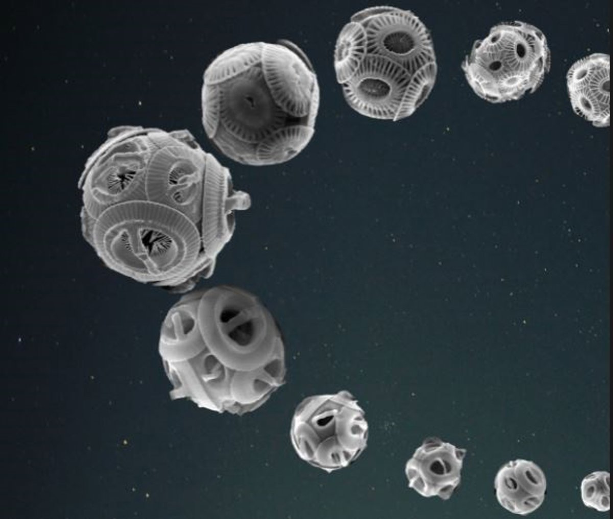 Los cocolitóforos son algas microscópicas que forman diminutas placas calcáreas, llamadas cocolitos, alrededor de sus células individuales. La forma y el tamaño de los cocolitos varía según la especie. Tras su muerte, los cocolitóforos se hunden en el fondo del océano y sus cocolitos se acumulan en los sedimentos, que registran fielmente la evolución detallada de estos organismos a lo largo del tiempo geológico.