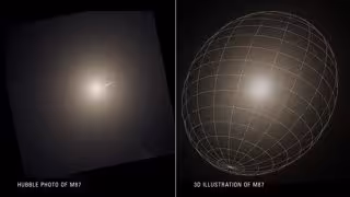 Una fotografía de la enorme galaxia elíptica M87 se compara con su forma tridimensional obtenida a partir de meticulosas observaciones realizadas con los telescopios Hubble y Keck.