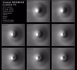 Una secuencia de ocho imágenes revela la rotación del cometa NEOWISE utilizando datos del telescopio Gemini North del Observatorio internacional Gemini en el Monte Maunakea de Hawai.