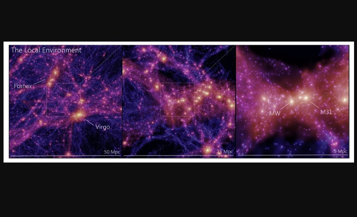 Esto significa que las estructuras familiares dentro de nuestro Universo Local, como los cúmulos de galaxias de Virgo, Coma y Perseo, la "Gran Muralla" y el "Vacío Local", nuestro hábitat cósmico, se reproducen en la simulación. En el centro de la simulación se encuentra quizás la estructura más importante, un par de galaxias, las contrapartes virtuales de nuestra propia Vía Láctea y nuestra vecina masiva cercana, la galaxia de Andrómeda.