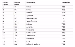 El primer aeropuerto español que aparece en el ranking de Airhelp es el de Bilbao. Ocupa la posición 16 en la clasificación mundial y, además, se convierte en el segundo mejor aeropuerto de Europa. Obtiene una puntuación general de 8,16 puntos, con un 8,3 en puntualidad, 8 en valoración de los clientes y un 7,7 en espacios de ocio como tiendas y restaurantes.
