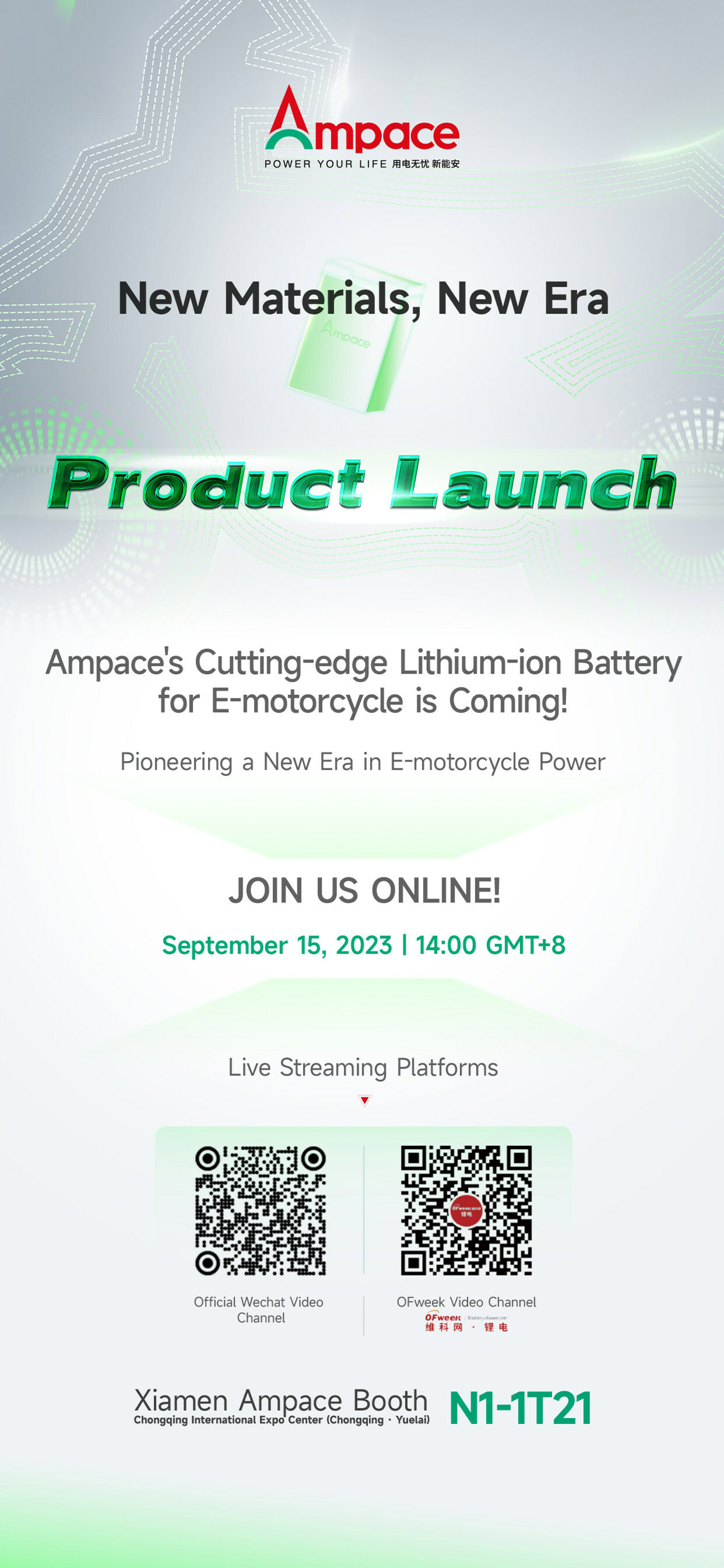 CHONGQING, China, 8 de septiembre de 2023 /PRNewswire/ -- El 15 de septiembre, Xiamen Ampace Technology Limited (en lo sucesivo, "Ampace"), una empresa pionera centrada en la investigación e innovación avanzadas en baterías de litio, está lista para hacer su aparición inaugural en la 21 Exposición Internacional de Comercio de Motocicletas de China. Ampace se está preparando para revelar una línea revolucionaria de materiales y productos de baterías de litio de vanguardia meticulosamente diseñados para motocicletas eléctricas. Con cuatro avances tecnológicos fundamentales: "máxima potencia, máxima seguridad, carga rápida y conexión paralela de paquetes múltiples", Ampace se dedica a presentar soluciones innovadoras para abordar los desafíos en potencia, alcance y seguridad que surgen de la tendencia en rápido crecimiento de la electrificación de motocicletas, para estar a la vanguardia del avance hacia una nueva era de propulsión de motocicletas eléctricas.