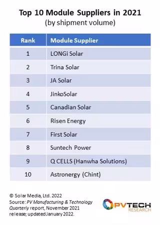 La clasificación más reciente se basa en la base de datos de oferta y demanda de PV InfoLink. En términos de tamaño de módulo, PV InfoLink estima que los envíos de módulos grandes por parte de los 10 principales fabricantes (excluyendo First Solar) son de aproximadamente 60 GW o más, lo que representa alrededor del 40% entre los envíos totales de los 10 principales en 2021, en el que los envíos en la segunda mitad del año fueron el doble de las de la primera mitad del año. Los módulos grandes se han convertido, con mucho, en los más populares.