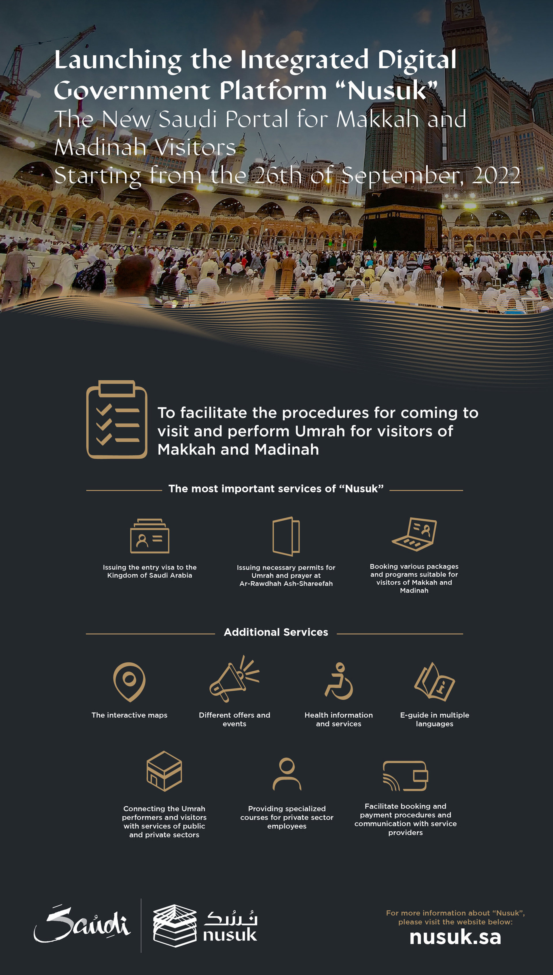 Nusuk se pone en marcha en cooperación y asociación con la Autoridad de Turismo Saudí para proporcionar toda la gama de servicios en todo el ecosistema de Visit Saudi, incluyendo la facilitación de visados, permisos, procesos de reserva y procedimientos. Nusuk también ofrece varios paquetes y programas para mejorar y enriquecer la experiencia de los musulmanes que visitan La Meca y Medina.