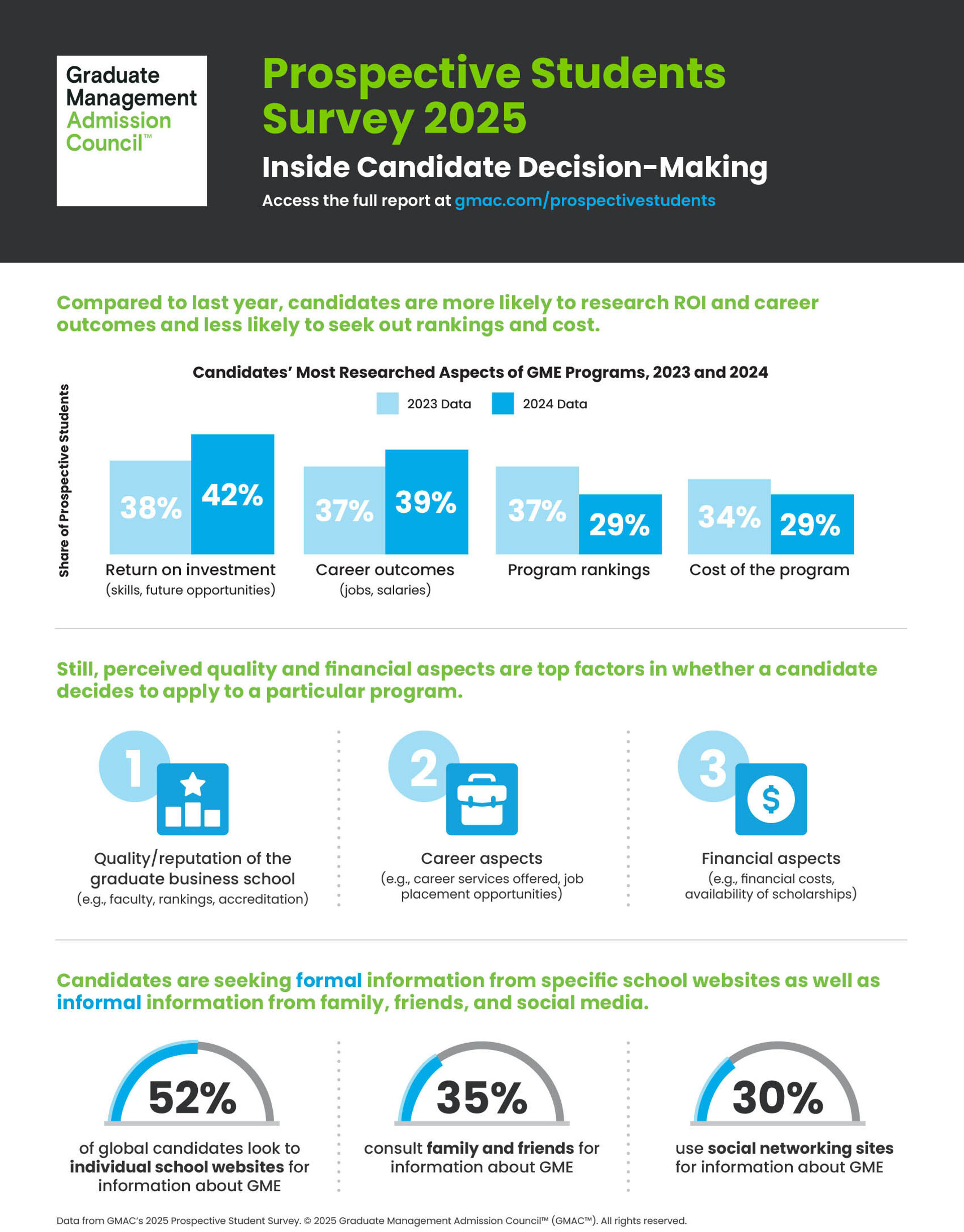 Con 15 años de respuestas a encuestas que representan a todas las regiones del mundo, la Encuesta de Futuros Estudiantes del GMAC ha proporcionado a las escuelas de negocios de posgrado de todo el mundo información crucial sobre los procesos de toma de decisiones de quienes actualmente consideran postularse a un programa de posgrado en administración. El informe resumido de este año analiza datos de 2024 de 4.912 encuestados en 147 países (45% mujeres y 67% de la generación Z), ofreciendo información sobre la evolución de la toma de decisiones de los candidatos para orientar las estrategias de las escuelas de negocios. El informe completo con hallazgos adicionales está disponible en gmac.com.
