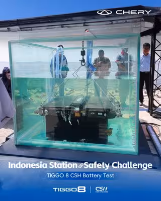 YAKARTA, Indonesia, 20 de junio de 2025 /PRNewswire/ -- El 17 de junio, Chery comenzó la segunda etapa de su Desafío de Seguridad Global en Yakarta, Indonesia, centrándose en el escenario de "humedad extrema" dentro de su sistema de evaluación de seguridad de seis dimensiones (calor, frío, sequedad, humedad, alta velocidad, y terreno accidentado). Esta prueba rigurosa validó la resistencia a la humedad y la corrosión de la "Batería Guardián" en Chery Super Híbrido (CSH). Heri Prabowo, responsable de la Subdirección de Pruebas de Tipo de Vehículos de Motor, Ministerio de Transporte, y Christian Andersen, notario, junto con representantes de 80 medios de comunicación líderes y KOLs de la industria, asistieron al evento para presenciar el rendimiento de la batería después de 53 horas y 51 minutos de remojo continuo en agua salada, demostrando cero fugas, cero cortocircuitos, y sin signos de fuga térmica. La batería mantuvo su integridad estructural y superó todas las validaciones técnicas de aislamiento eléctrico. Una vez instalada en el vehículo, arrancó con éxito en el primer intento y suministró energía estable durante toda la prueba en carretera, completando el riguroso desafío sin anomalías.