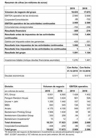 Bertelsmann es una empresa de medios de comunicación, servicios y educación con actividad en cerca de 50 países del mundo. La corporación incluye el grupo de televisión RTL Group, el grupo de editoriales de libros Penguin Random House, la editorial de revistas Gruner + Jahr, la empresa de música BMG, el proveedor de servicios Arvato, Bertelsmann Printing Group, Bertelsmann Education Group y la red internacional de fondos de inversión Bertelsmann Investments. Con 126000 empleadas y empleados, en el ejercicio 2019 el grupo alcanzó un volumen de negocio de 18000 millones de euros. Bertelsmann es sinónimo de creatividad y emprendimiento. Esta combinación da origen a ofertas mediáticas de alta gama y servicios innovadores que entusiasman a clientes de todo el mundo. Bertelsmann aspira a convertirse en una empresa climáticamente neutra en 2030.