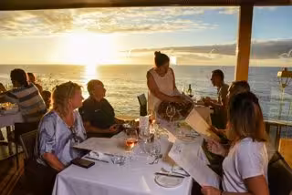 Su amplia oferta se completa con una excelente carta de vinos, entre los que destaca el Brunellis el vino de la casa-, variados postres, un cuidadoso servicio, y la posibilidad de contemplar las mejores puestas de sol de la isla desde su impresionante terraza abierta al mar. Un impresionante ventanal ofrece la mejor vista al Océano Atlántico, única en el mundo y de un valor incalculable.