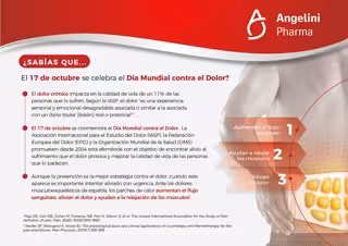 Angelini Pharma se compromete en dar esperanza a los pacientes de una manera constante y con un enfoque hacia la salud mental, incluido el dolor, las enfermedades raras y la salud del consumidor. Angelini Pharma es una "empresa integrada" con amplios y reconocidos programas de I + D, plantas de producción "World Class" y actividades de comercialización internacional de ingredientes activos y medicamentos líderes en el mercado. Para más información, visite www.angelinipharma.com. Angelini Pharma España es una compañía farmacéutica centenaria con más de 40 años de implantación en España y una mentalidad joven y dinámica. Nos mueve la pasión por nuestro paciente, y por ello tenemos el compromiso de evolucionar e innovar constantemente para mejorar su calidad de vida. Crecemos conjuntamente con nuestros partners, basando nuestra colaboración en lo que nos define: integridad, coraje y pasión. Se puede encontrar más información sobre Angelini Pharma España en www.angelinipharma.es. [1] Raja SN, Carr DB, Cohen M, Finnerup NB, Flor H, Gibson S, et al. The revised International Association for the Study of Pain definition of pain. Pain. 2020; 161(9):1976-1982. [2] Nadler SF, Weingand K, Kruse RJ. The physiological basis and clinical applications of cryotherapy and thermotherapy for the pain practitioner. Pain Physician: 2004:7:395-399.