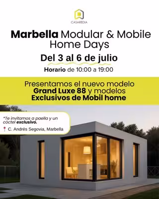 Marbella, 30 de junio de 2025. - Casaredia Marbella presenta el modelo Grand Luxe, una casa modular exclusiva de 88 m totalmente personalizable. Del 3 al 6 de julio, los asistentes podrán explorar esta vivienda moderna junto con varias mobil homes listas para este verano, disfrutar de un cóctel y paella, así como resolver dudas con expertos. Durante el evento, se ofrecerán electrodomésticos y aire acondicionado gratuitos por la compra de las viviendas o Mobil Homes