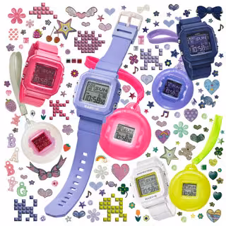 El reloj y el juego de soporte especial vienen en variaciones de colores pop inspiradas en los colores de moda Y2K alrededor del año 2000. Presione el botón de luz cuando el reloj esté en el modo de hora normal y aparecerán una serie de animaciones de pixel art aleatoriamente en la pantalla LCD para un toque extra divertido.