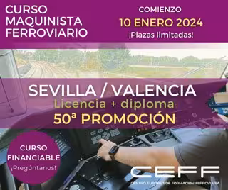 El Centro Europeo de Formación Ferroviaria (CEFF) lanza una nueva edición del curso de maquinista ferroviario que comenzará el próximo 10 de enero. La formación se llevará a cabo en las sedes del centro de Sevilla y Valencia, simultáneamente, con un total de 50 plazas disponibles. El plazo de preinscripción se cerrará el 27 de noviembre a partir de las 14.00 horas y la prueba de acceso tendrá lugar un día después. El periodo de matriculación empezará a partir del 30 de noviembre.