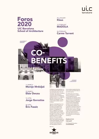 Bajo el título "Co-benefits" ("Beneficios colaterales") Foros 2020 pretende reflexionar sobre los vínculos y los procesos de interacción cultural entre la arquitectura contemporánea y otras manifestaciones artísticas como la danza, la escultura, el cine o el cómic. El ciclo está dirigido, por segundo año consecutivo, por los profesores Guillem Carabí y Fredy Massad. "Del mismo modo que el arte contemporáneo, en sus distintas manifestaciones, se apodera en numerosas ocasiones de elementos arquitectónicos, liberados de cualquier connotación de habitabilidad, la arquitectura se sirve de las diversas disciplinas artísticas para reivindicar su carácter emocional y recuperar así algunos de los vínculos perdidos con sus usuarios", explican.