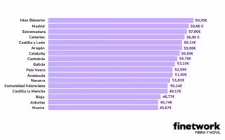 Madrid, 5 de septiembre de 2024.- Finetwork, compañía española de fibra y móvil, ha compartido los resultados de un estudio que revela lo que pagan los ciudadanos españoles en su tarifa de Internet fijo y móvil. Así, de media, los españoles pagan 54 euros al mes por estos paquetes de conectividad. Por comunidades autónomas, los ciudadanos de baleares lideran este listado, declarando un gasto medio de 60,70 al mes, seguidos por los madrileños (58,86 euros) y los extremeños (57,80 euros). En el extremo opuesto, los murcianos serían los que menos pagan por sus servicios de fibra y móvil, con una media de 45,67 euros, más de 15 euros por debajo del primer puesto y 8 euros menos que la media nacional.