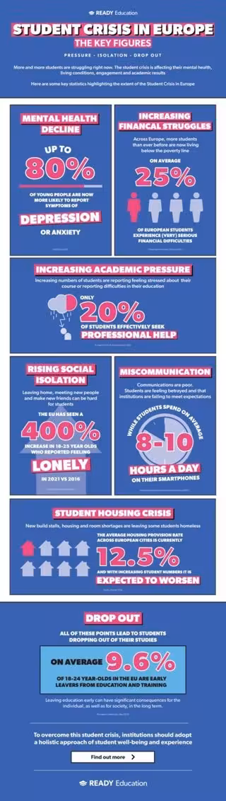Como resultado del creciente número de áreas de preocupación, el bienestar de los estudiantes y su educación se están viendo afectados negativamente por la presión que enfrentan y ha habido un fuerte aumento en el abandono escolar. Esto crea un crecimiento masivo en la demanda de apoyo que las instituciones están luchando por mantener y, a su vez, está acumulando más presión sobre los ya sobrecargados presupuestos de bienestar estudiantil y del personal. Debido a la sólida visión de Ready Education de mejorar el éxito de los estudiantes en la educación superior en todo el mundo, han estado monitoreando de cerca todos los aspectos de esto dentro de la educación terciaria y buscando activamente soluciones.