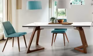 Por ellos las mesas de comedor extensibles con sobre porcelánico cada vez son más demandadas. Pueden combinarse con patas metálicas o con patas de madera. El resultado es una mesa espectacular que se convierte en la estrella del comedor.
