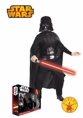 Para los seguidores del lado oscuro, no puede faltar este disfraz con caja del villano más conocido y poderoso de la galaxia. Los niños podrán convertirse en Darth Vader con este disfraz compuesto por traje completo con detalles impresos, máscara, capa y espada con luz. 'Que la fuerza te acompañe'.