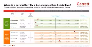 El estudio LCA de Garrett sugiere que, para afrontar el desafío de la reducción de CO2 de la forma más eficaz posible, los vehículos eléctricos con batería y los vehículos híbridos deberían utilizarse juntos, de forma complementaria, para satisfacer una amplia variedad de usos diarios. Por tanto, el estudio concluye que los mandatos "100 por ciento BEV", como el que se implementará en Europa de aquí a 2035, no son una solución óptima para reducir el impacto medioambiental de los coches y vehículos comerciales.