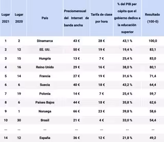 Dinamarca, el país con las mejores condiciones para estudiar en línea, es también el más caro: de media, los estudiantes pagan 28 por hora. Suiza es el segundo país más caro, con 27 , seguido de Luxemburgo, donde cada hora de clase alcanza los 25 .