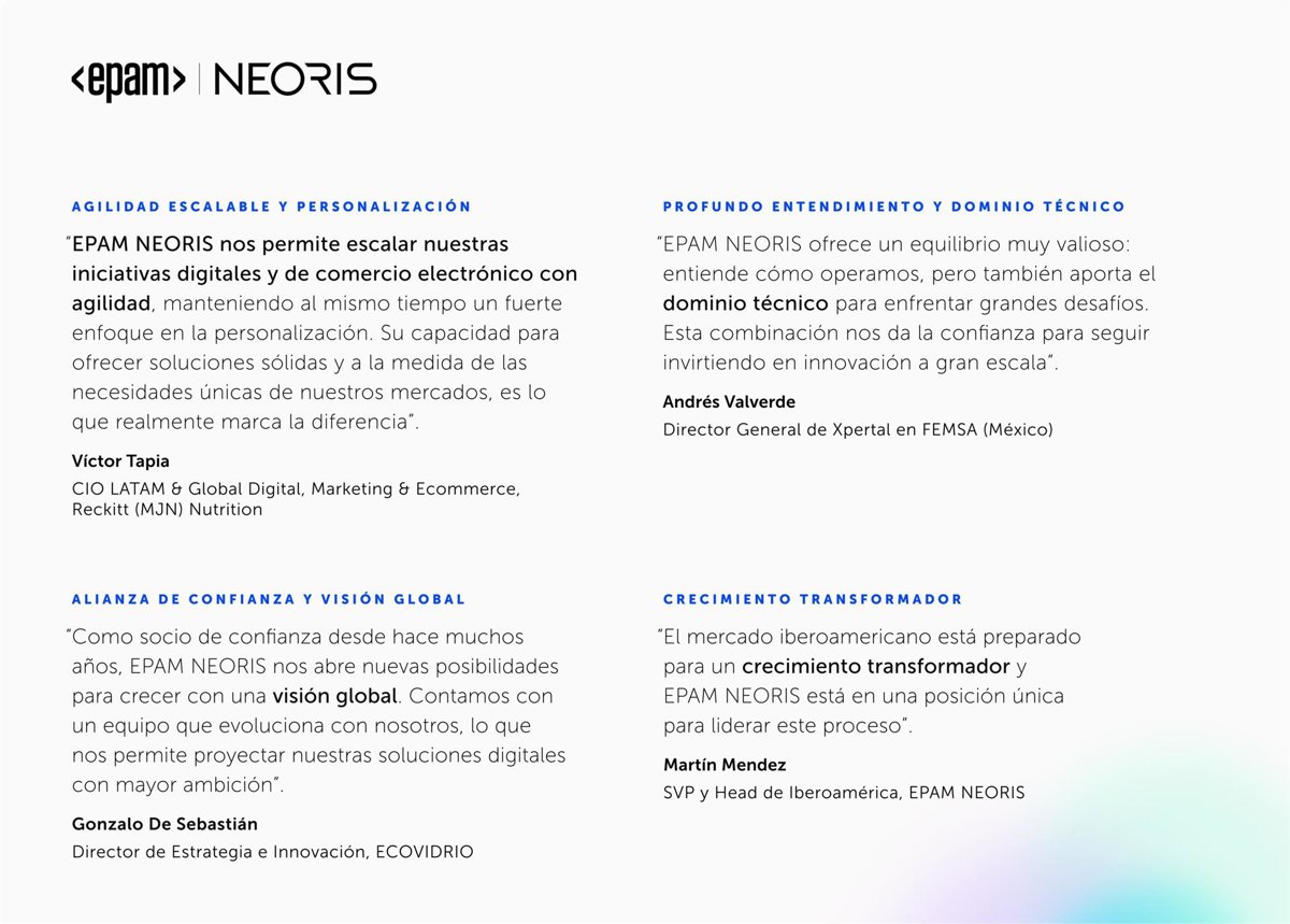 • Mentalidad centrada en el cliente y nativa en IA: EPAM NEORIS se asocia con sus clientes para cocrear soluciones, apalancadas en prácticas avanzadas de ingeniería y un ecosistema robusto de líderes tecnológicos globales estratégicos.