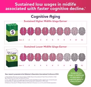 El estatus socioeconómico (SES por sus siglas en inglés) reflejando tanto las medidas sociales como las económicas de la experiencia laboral de una persona, y del acceso económico a los recursos y posición social de un individuo o de una familia ha sido vinculado a la salud y el bienestar tanto físicos como psicológicos. La investigación que examina su impacto en la cognición está creciendo, y los hallazgos claves presentados en el AAIC 2022 incluyen: