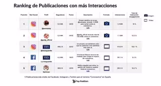 Top Position ha realizado un estudio sobre la viralidad de publicaciones relacionadas con el coronavirus en Facebook, Twitter e Instagram, analizando las publicaciones con más interacción en cada una de estas redes sociales. Instagram es la red social más viral, alcanzando con las primeras diez publicaciones los 4,5 millones de interacciones, seguida de Facebook con 1,6 millones millones y Twitter con 382.000 interacciones