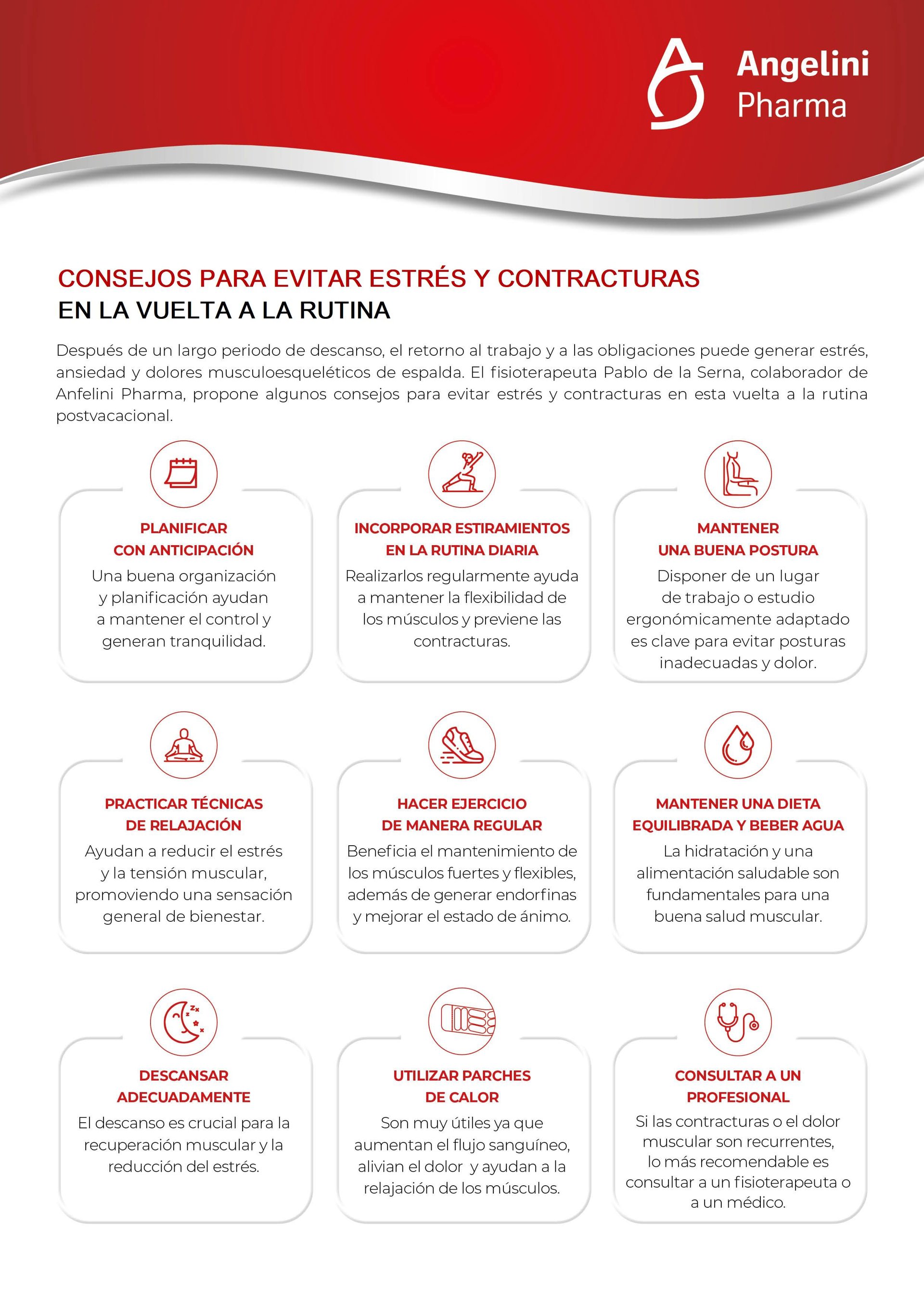Volver a la rutina después de un período de descanso puede ser un desafío, especialmente si se quiere evitar el estrés y las contracturas musculares. Pablo de la Serna, fisioterapeuta, experto en terapia de calor y colaborador de Angelini Pharma, ofrece algunos consejos para gestionar la vuelta de las vacaciones. "El estrés provocado por las cargas emocionales que suponen retomar la actividad de manera brusca puede causar tensión muscular y contracturas desde la cabeza a la zona lumbar", explica