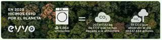 EVVO está adherida a diferentes fundaciones y organizaciones sin ánimo de lucro, que tienen la misión de preservar el medio ambiente y promover prácticas responsables dentro de la normativa legal. El pasado año, gracias a la colaboración existente entre EVVO y ECOLEC, entidad que representa al sector de fabricantes y grandes importadores de electrodomésticos, y ejemplar en la gestión de los residuos de aparatos eléctricos y electrónicos, EVVO recicló más de 434 toneladas entre gama blanca y PAE (pequeños aparatos electrodomésticos). Esta cantidad equivaldría a 207.417,32 kg de CO2 que no han llegado a la atmósfera y al C02 que absorbe, al día, el siguiente número de árboles: 10.537.434,56*. El objetivo de este año es superar las 500 toneladas.