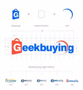 Geekbuying elige el azul y el rojo como colores primarios del nuevo logotipo, mientras que el color de fondo del sitio web es azul y blanco. La letra G inicial se sitúa en una "bolsa de la compra" tras el diseño de la fuente; la tierra se utiliza como prototipo para simplificar el círculo abstracto cortado en la parte "ing". Simboliza que Geekbuying está ahora y seguirá estando comprometido con el establecimiento de un canal de marca global eficiente en el futuro.