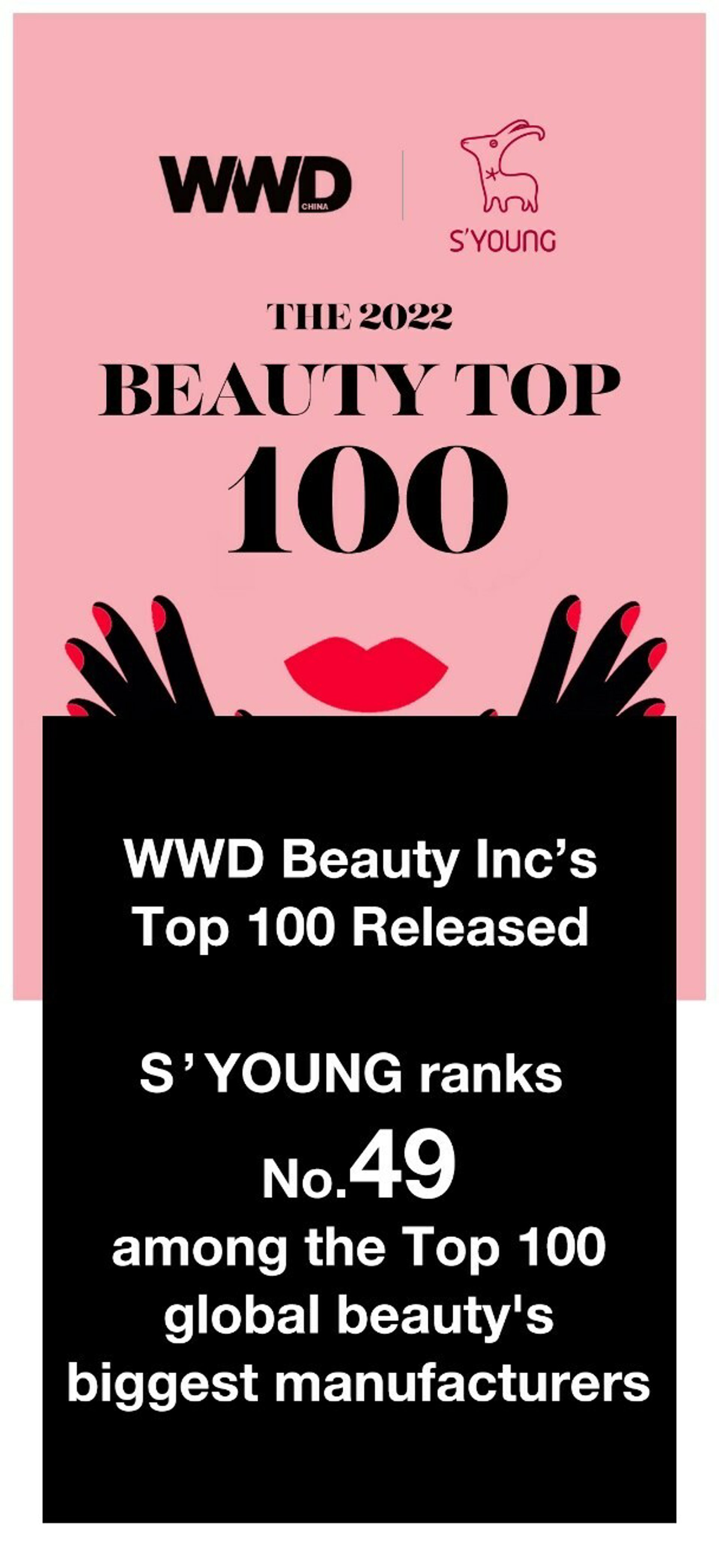 SHANGHÁI, 27 de abril de 2023 /PRNewswire/ -- S'Young Group Co. Ltd. (S'Young, la empresa) (300740.SZ) ha entrado por primera vez en la clasificación anual de las 100 mejores empresas de belleza de Women's Wear Daily (WWD) en 2022. Gracias a su excelente rendimiento en 2022, S'Young se ha clasificado en el puesto 49 y se ha unido a otras empresas de belleza de renombre mundial en la lista de las 100 mejores. Este debut marca un nuevo hito de gran importancia para S'Young.